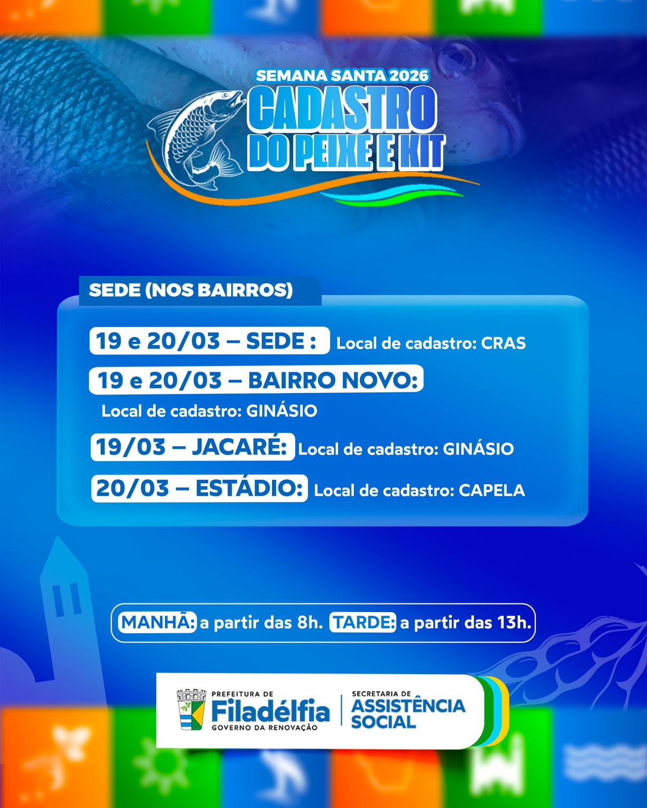 A Prefeitura de Filadélfia, por meio da Secretaria de Assistência Social, informa que será iniciado o cadastro para a distribuição do Peixe e do Kit