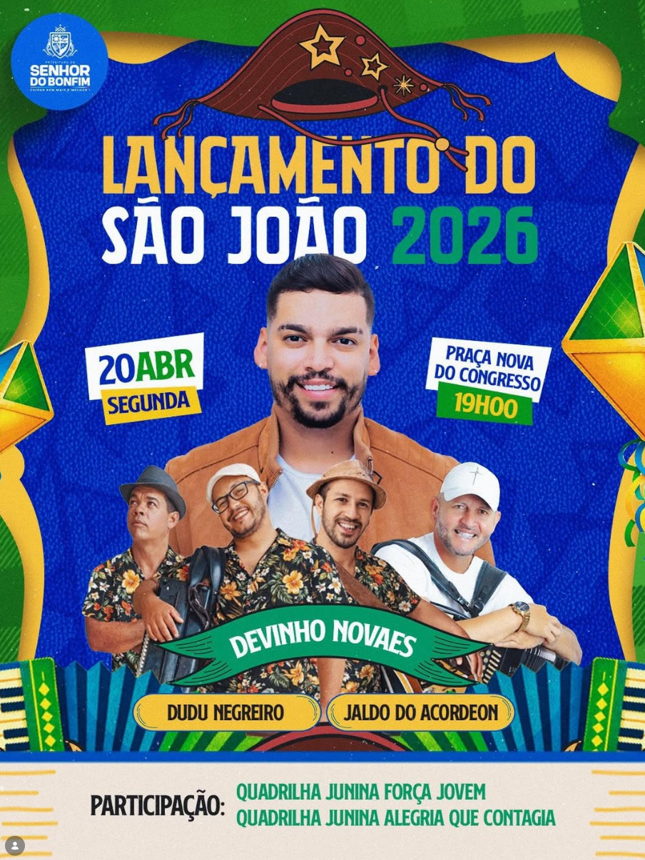 A Prefeitura de Senhor do Bonfim confirmou a realização do lançamento oficial do São João 2026, dando início à contagem regressiva para um dos eventos mais tradicionais e aguardados do calendário cultural da Bahia. O evento de lançamento acontecerá na próxima segunda-feira, 20 de abril, às 19h, na Praça Nova do Congresso, reunindo moradores e visitantes para apresentar as primeiras atrações da festa. Entre os nomes confirmados estão Devinho Novaes, Dudu Negreiro e Jaldo do Acordeon, além da participação de quadrilhas juninas locais. Reconhecida como a “Capital Baiana do Forró”, a cidade já começa a entrar no clima junino, com grande expectativa de público e impacto positivo na economia, especialmente nos setores de comércio, turismo e serviços. Em publicação nas redes sociais, a prefeitura destacou o entusiasmo para o início dos festejos. “Prepare o coração, porque o melhor São João do Brasil já começa com tudo”, diz o anúncio oficial. O São João de Senhor do Bonfim é considerado um dos maiores do estado e atrai milhares de turistas todos os anos, fortalecendo a cultura nordestina e gerando emprego e renda para a população local. A informação foi divulgada no perfil oficial da Prefeitura de Senhor do Bonfim no Instagram.