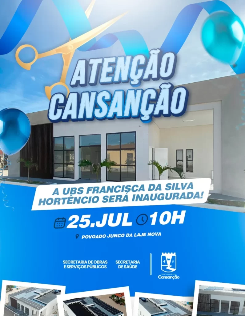 A Prefeita de Cansanção Vilma Gomes, convida toda a população para a inauguração da Unidade Básica de Saúde Francisca da Silva Hortêncio, que será realizada no próximo dia 25 de julho, às 10h, no Povoado Junco da Laje Nova. A nova unidade foi construída com recursos do Programa Novo PAC 2024 e representa um avanço significativo na saúde pública do município, com foco no atendimento primário e humanizado à população.