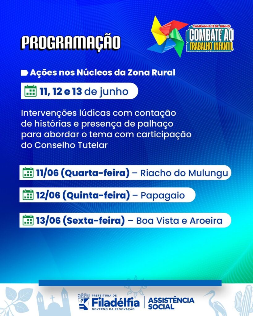Em alusão ao Dia Mundial Contra o Trabalho Infantil, celebrado em 12 de junho, a Prefeitura de Filadélfia, por meio da Secretaria Municipal de Assistência Social, CRAS e Conselho Municipal dos Direitos da Criança e do Adolescente (CMDCA), promove uma série de ações de conscientização sobre os impactos do trabalho infantil e a importância de garantir uma infância protegida.