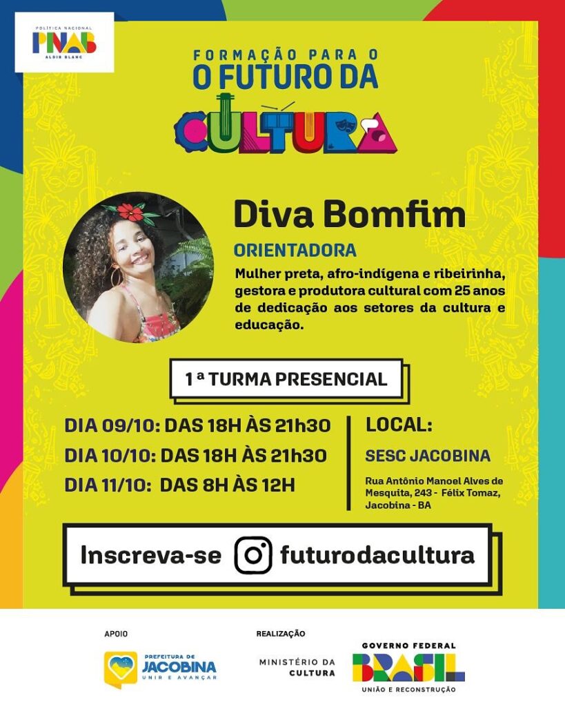 A cidade de Jacobina (Bahia) está sediando a primeira turma presencial do programa “Formação para o Futuro da Cultura”, iniciativa que tem como objetivo capacitar artistas, produtores e realizadores culturais na área de gestão de projetos. A formação acontece entre os dias 9 e 11 de outubro, no SESC Jacobina, reunindo agentes culturais locais e regionais.