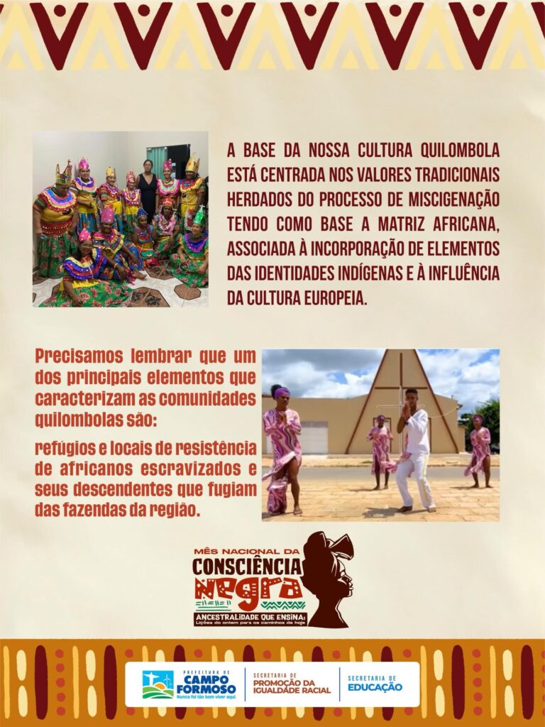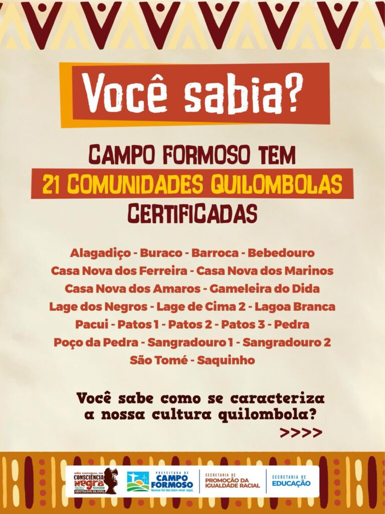 A iniciativa da prefeitura integra a programação do Mês Nacional da Consciência Negra, reforçando o reconhecimento às raízes culturais e à luta histórica das comunidades tradicionais que fazem parte da formação social de Campo Formoso.