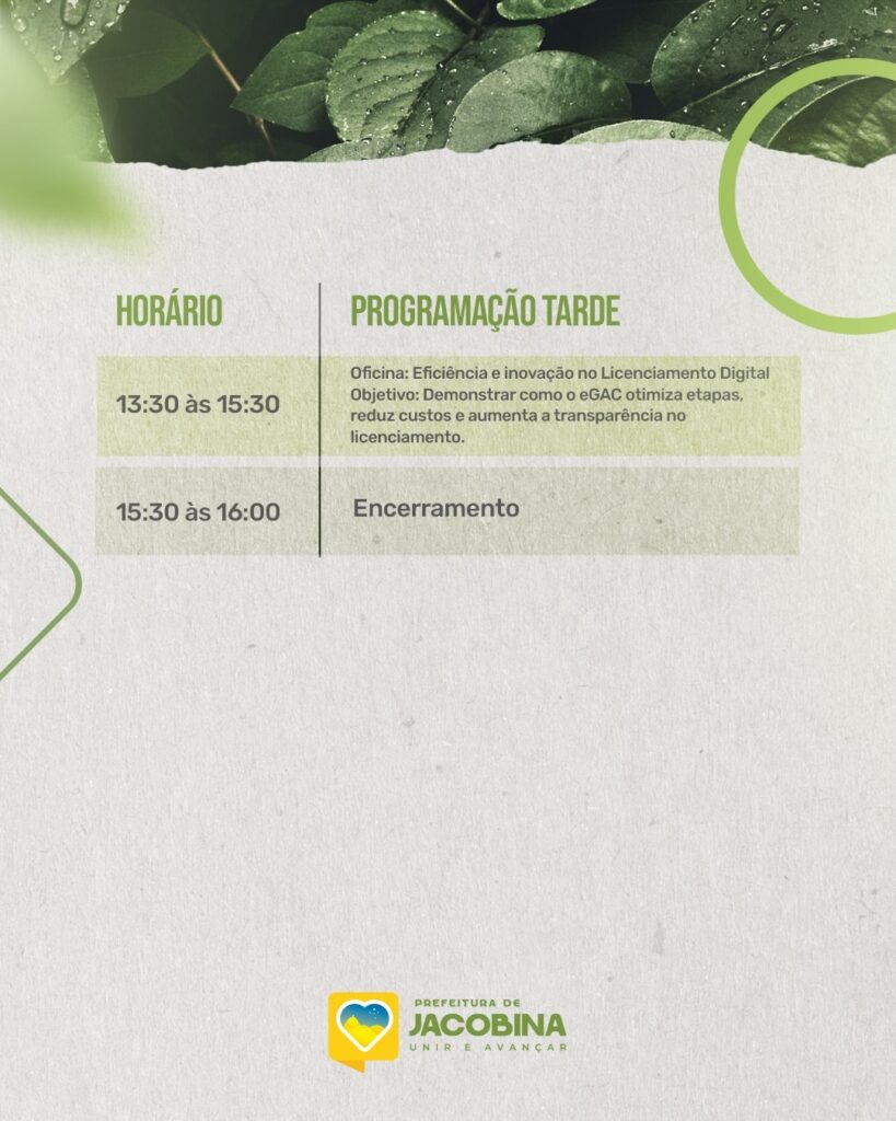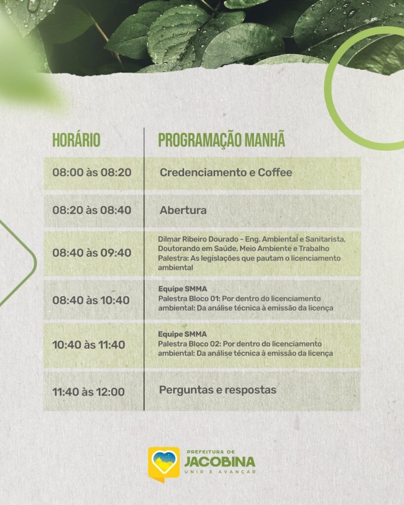 A Prefeitura de Jacobina, por meio da Secretaria Municipal de Meio Ambiente (SMMA), anunciou a abertura das inscrições para o 1º Seminário de Licenciamento Ambiental: Responsabilidade Socioambiental, que será realizado no dia 03 de dezembro de 2025, no Auditório da ACIJA, em um encontro que promete reunir especialistas, estudantes e profissionais do setor ambiental.