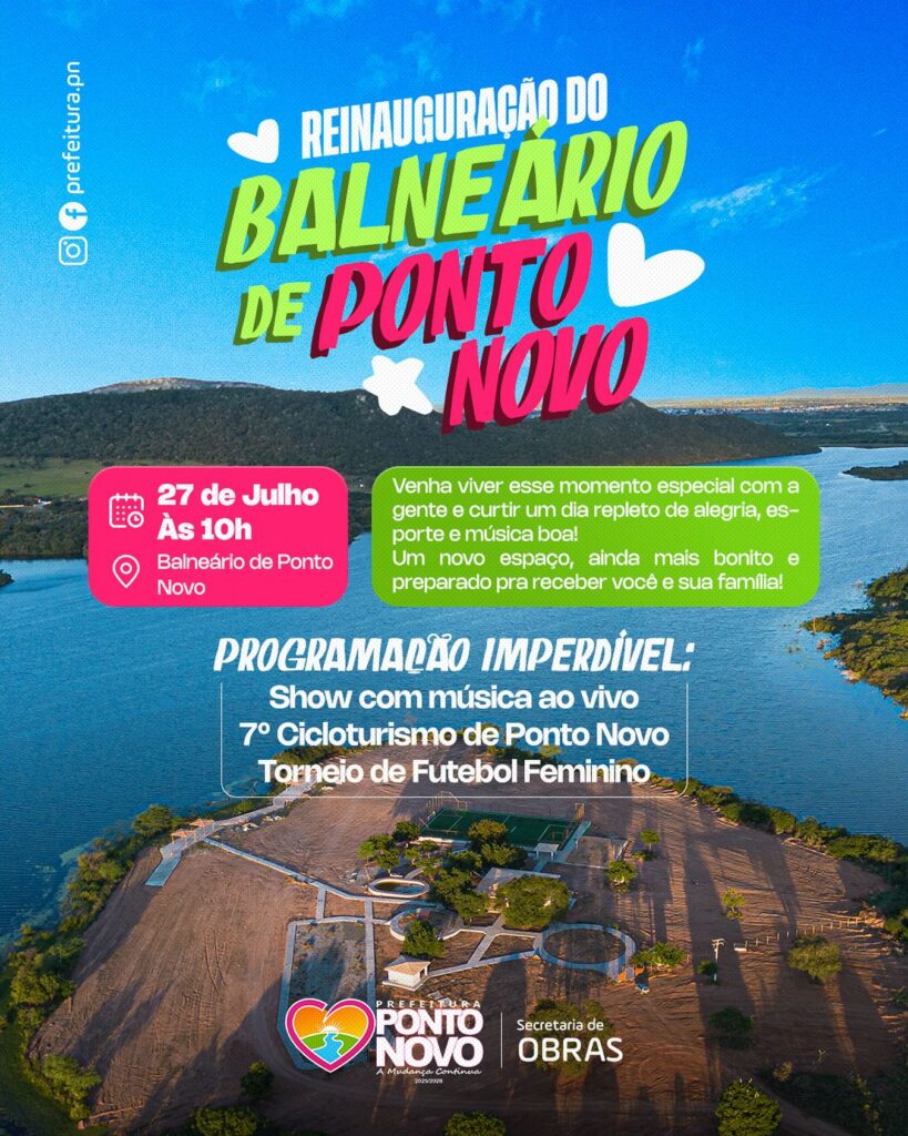 A Prefeitura de Ponto Novo promove, neste domingo (27), a esperada reinauguração do Balneário Municipal, um dos principais pontos de lazer e convivência da cidade. A partir das 10h, a população está convidada para participar de um dia especial, com uma programação diversificada que celebra a revitalização do espaço público e promove o bem-estar da comunidade.