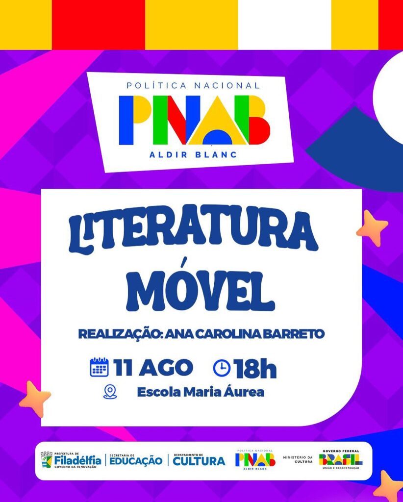 A Prefeitura de Filadélfia, por meio da Secretaria Municipal de Educação e do Departamento de Cultura, realizará na próxima segunda-feira, 11 de agosto, às 18h, na Escola Maria Áurea, o evento de culminância do Projeto Literatura Móvel.